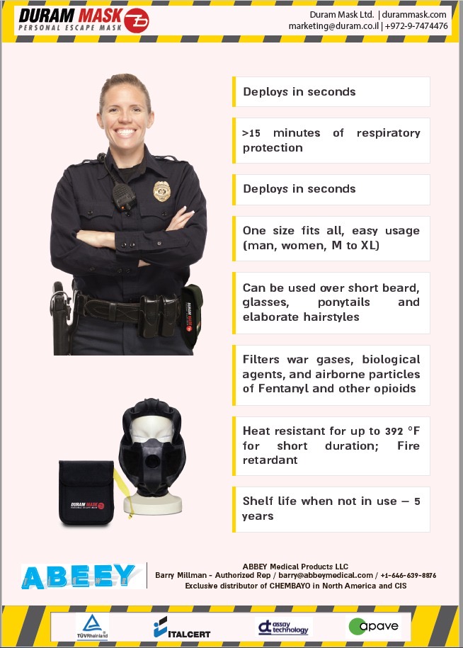 This respiratory protective device is designed for evacuation in case of an emergency involving weaponized chemical and biological agents. The CHEMBAYO chemical / biological escape mask provides users with short-term respiratory protection against low concentrations of various chemical and biological toxins, with an emphasis on protection against nerve and blood agents, combined with HEPA filtration capabilities (P3) that filter out particles and aerosols, greatly reducing respiratory exposure.